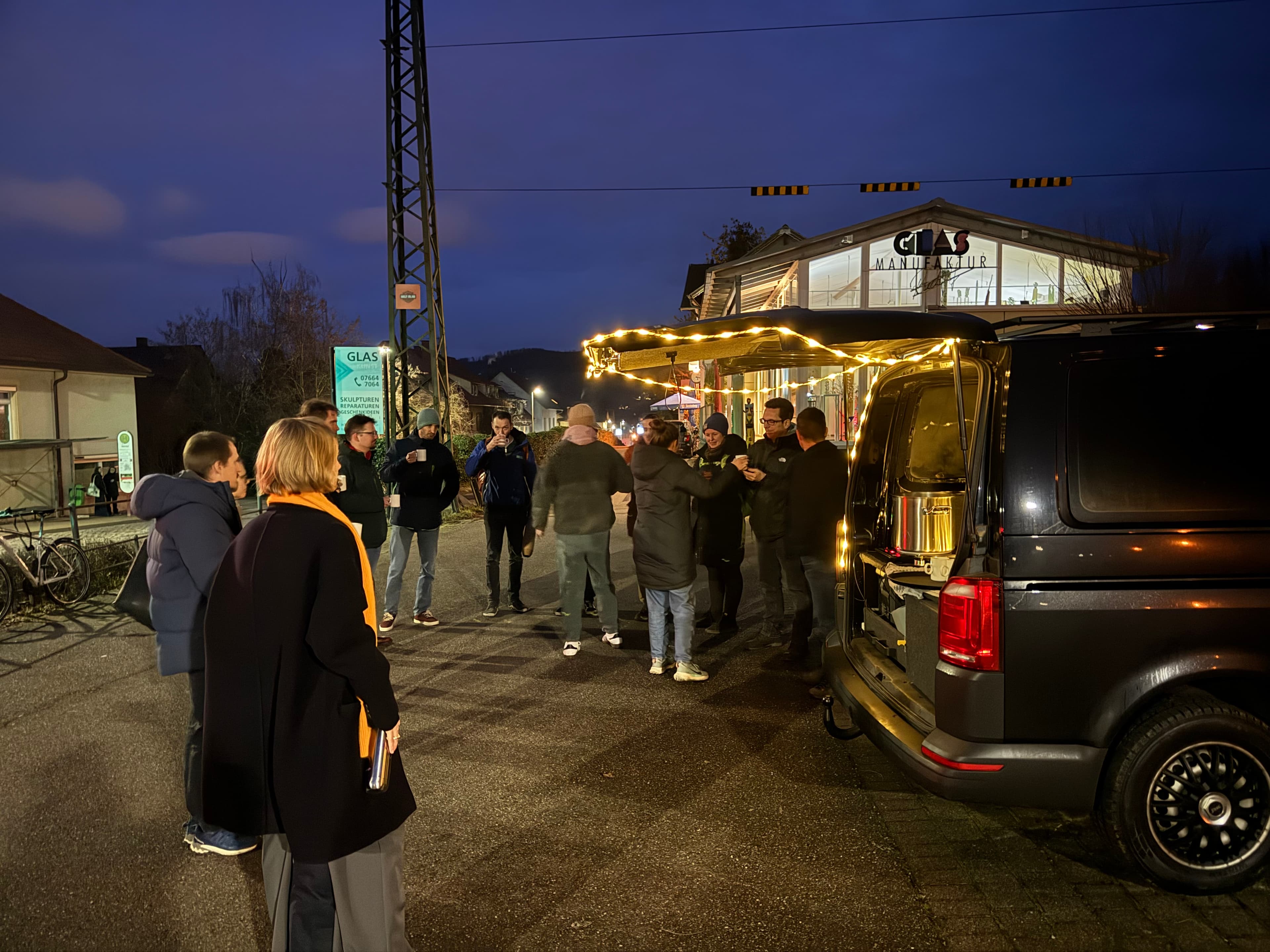 Danach ging es mit Glühwein weiter Richtung Esswerkstatt. Dort haben wir gemeinsam ein köstliches Drei-Gänge-Menü gekocht, geschnippelt, gelacht und am Ende zusammen gegessen. Kein grosses Tamtam, sondern genau die Art von Abend, die daran erinnert, warum Zusammenarbeit mehr ist als Termine und To-dos.