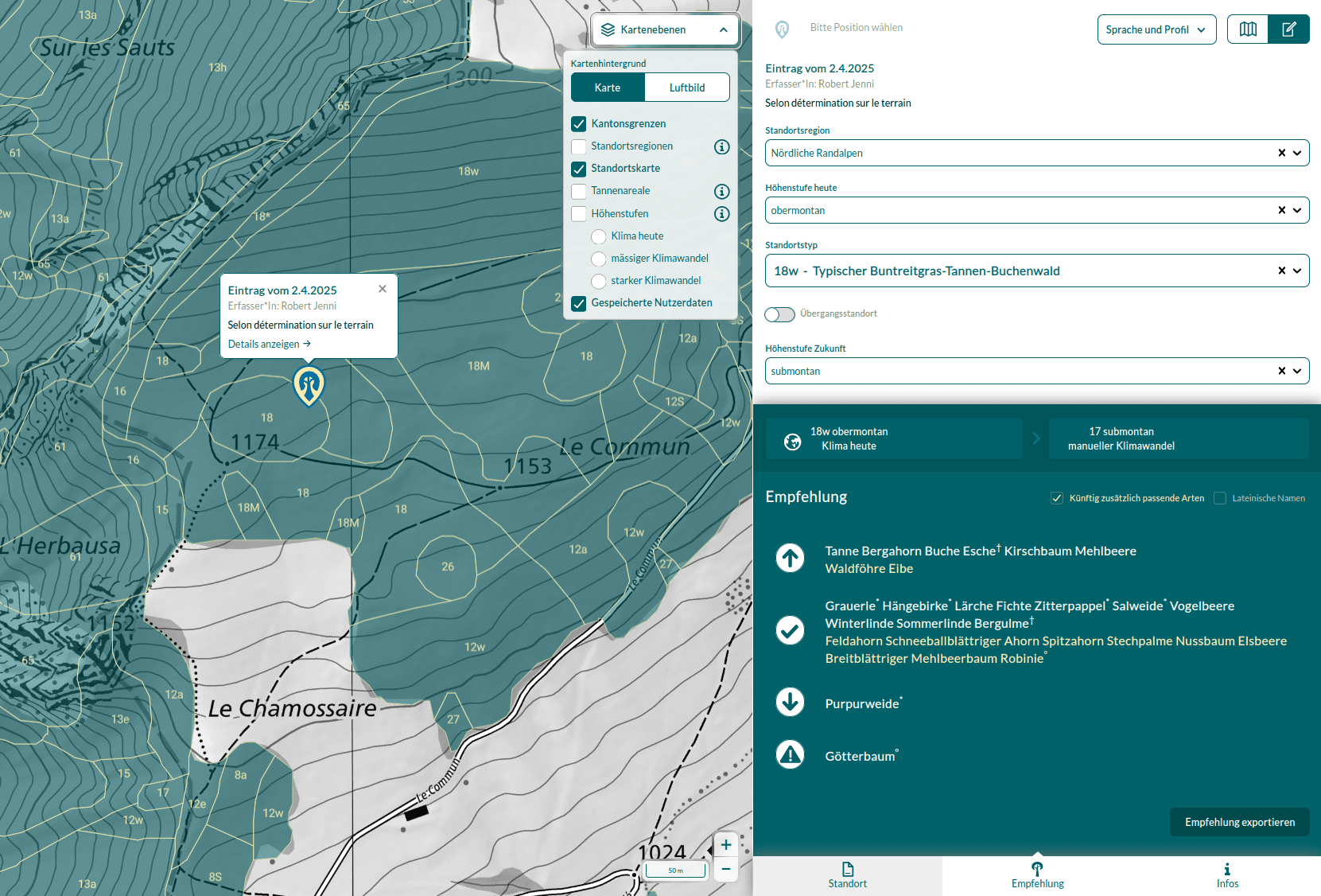 Despite the extensive technical adjustments, one thing remains unchanged: The scientific logic and data basis of the Tree App. All recommendations continue to be based on the sound findings of the WSL, including the defined site types, altitude levels and climate scenarios. Existing profiles and their content have also been carefully adopted and adapted.